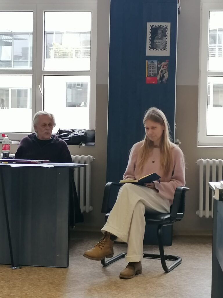 Této příležitosti využily čtyři studentky předmětu Č2, které se přihlásily na workshop poezie pod vedením básníka, spisovatele, textaře, písničkáře, překladatele a také autora četných rozhlasových a televizních her Jiřího Dědečka.