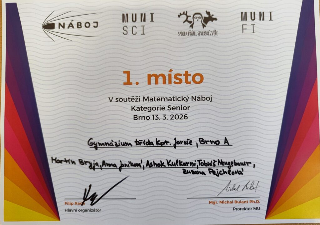 Dne 13. března 2026 se na různých soutěžních místech v rámci i mimo ČR konala matematická soutěž Náboj. Naše škola obsadila první dvě místa v rámci Brna, v měřítu České Republiky pak místo 3. a 6. Jmenovitě jde o: